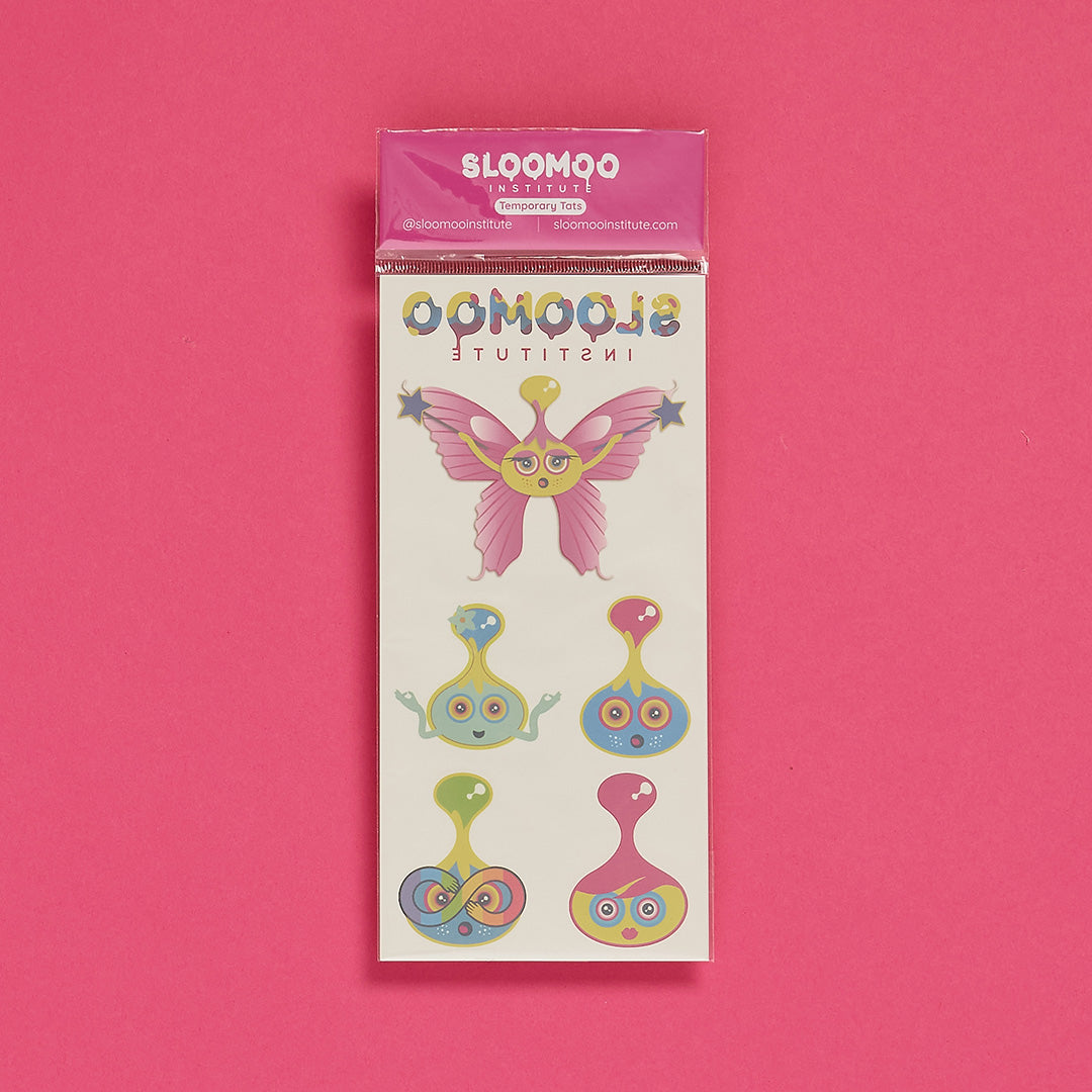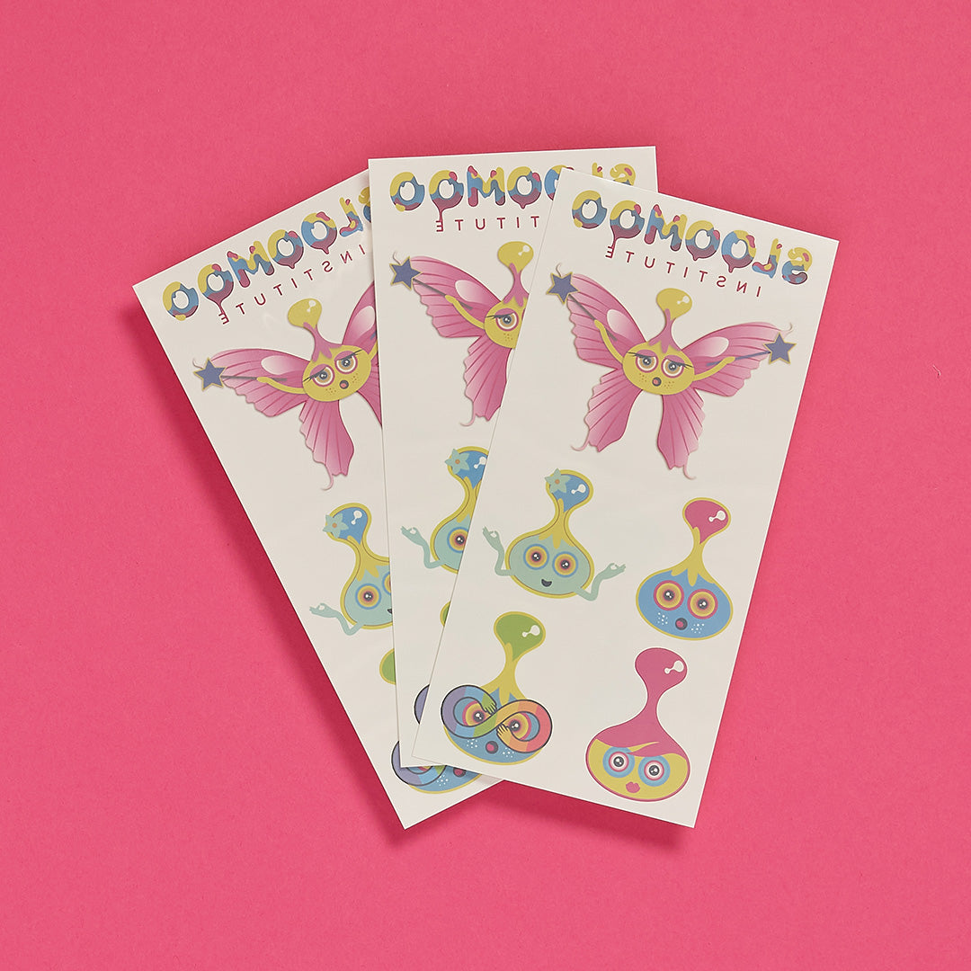 Pack of three Sloomoo Institute temporary tattoo sheets.
