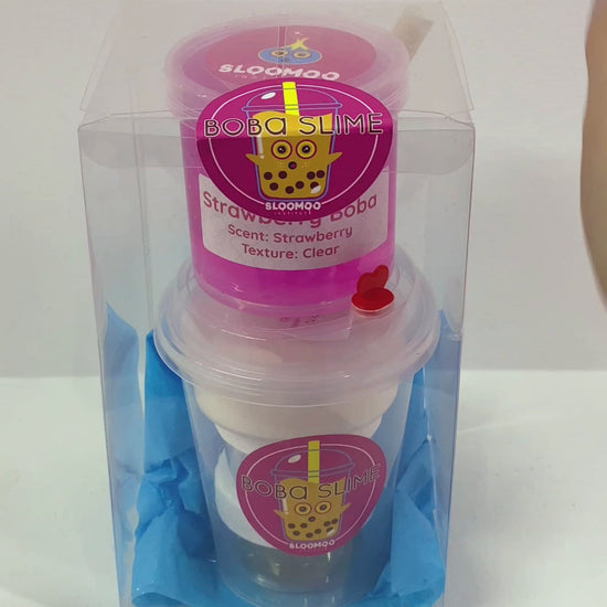 Our build your own boba boxes come with a clear slime base, dark beads that represent tapioca, and an extra add-in based on the type you choose (jelly cubes, "chocolate crumbles," or fruity Fimos). A small slime is included to act as the topper.