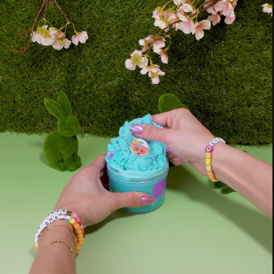 We made the ultimate Easter Egg Hunt with this eye popping turquoise cloud dough slime, enhanced with colorful clay polka dots (the “eggs”). It feels rich and dough-like, the ultimate joy after an actual egg hung. We’re loving the pistachio ice cream scent. It’s egg-cellent.