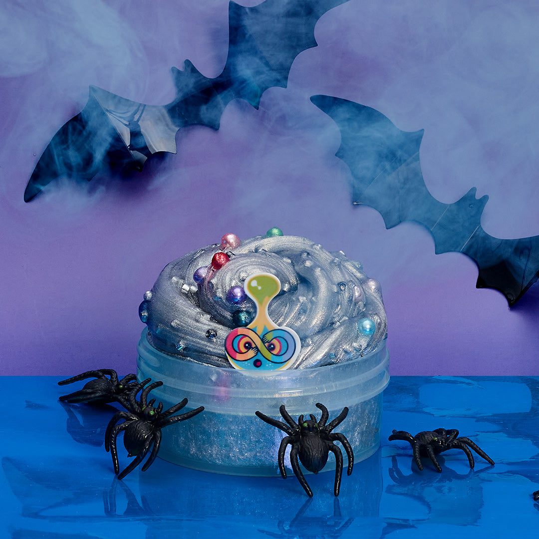 Everything looks more upside down, turned around, and crazy with a fun house mirror. Hence this silver metallic slime, topped with a rainbow of pearl beads, and black and silver metallic bingsu. It's just the thing you need to tap into the energy of Halloween.