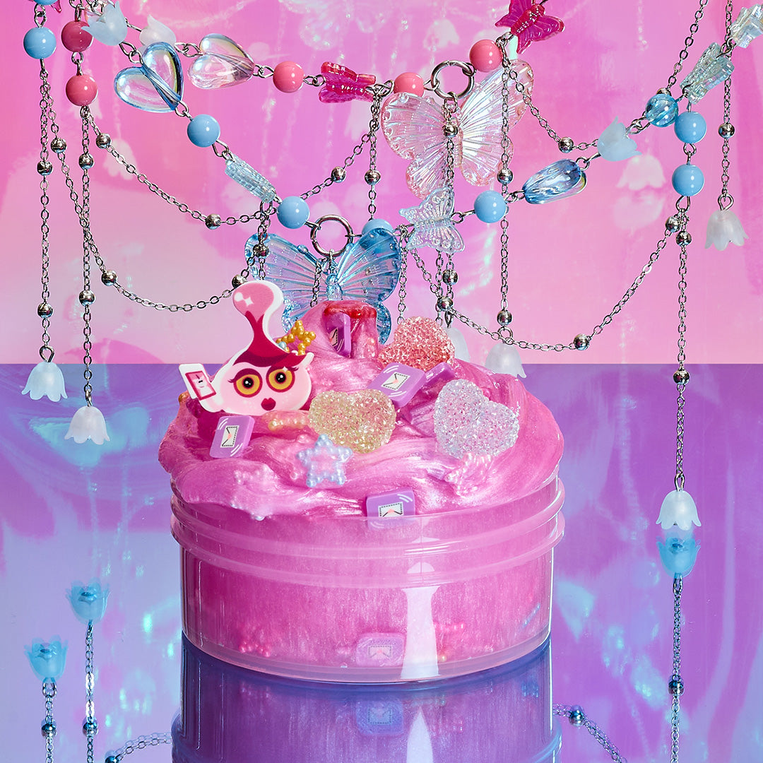 For all of you Y2K Girls, we have the perfect slime for you. It's a playful, metallic pink and loaded with an explosion of rainbow colored stars, email Fimos, sparkly heart beads, and the phone addicted LooLoo Sloomoo character as a charm.