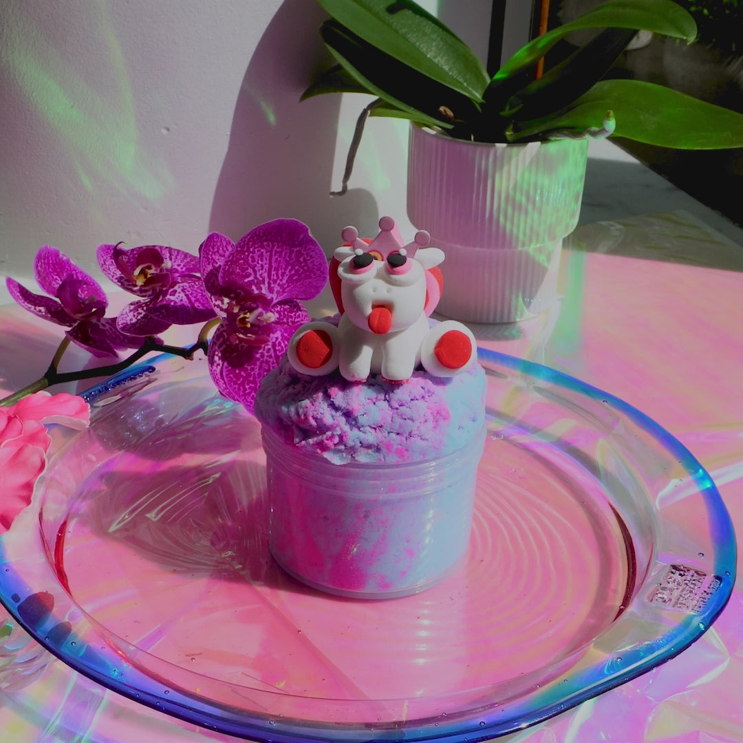 This magestic unicorn (with a heart shaped tail and crown on her head) sits atop a fluffy throne of cloud slime, enhanced with shimmer, of course. The scent of Neapolitan ice cream makes it all the more sweet.
