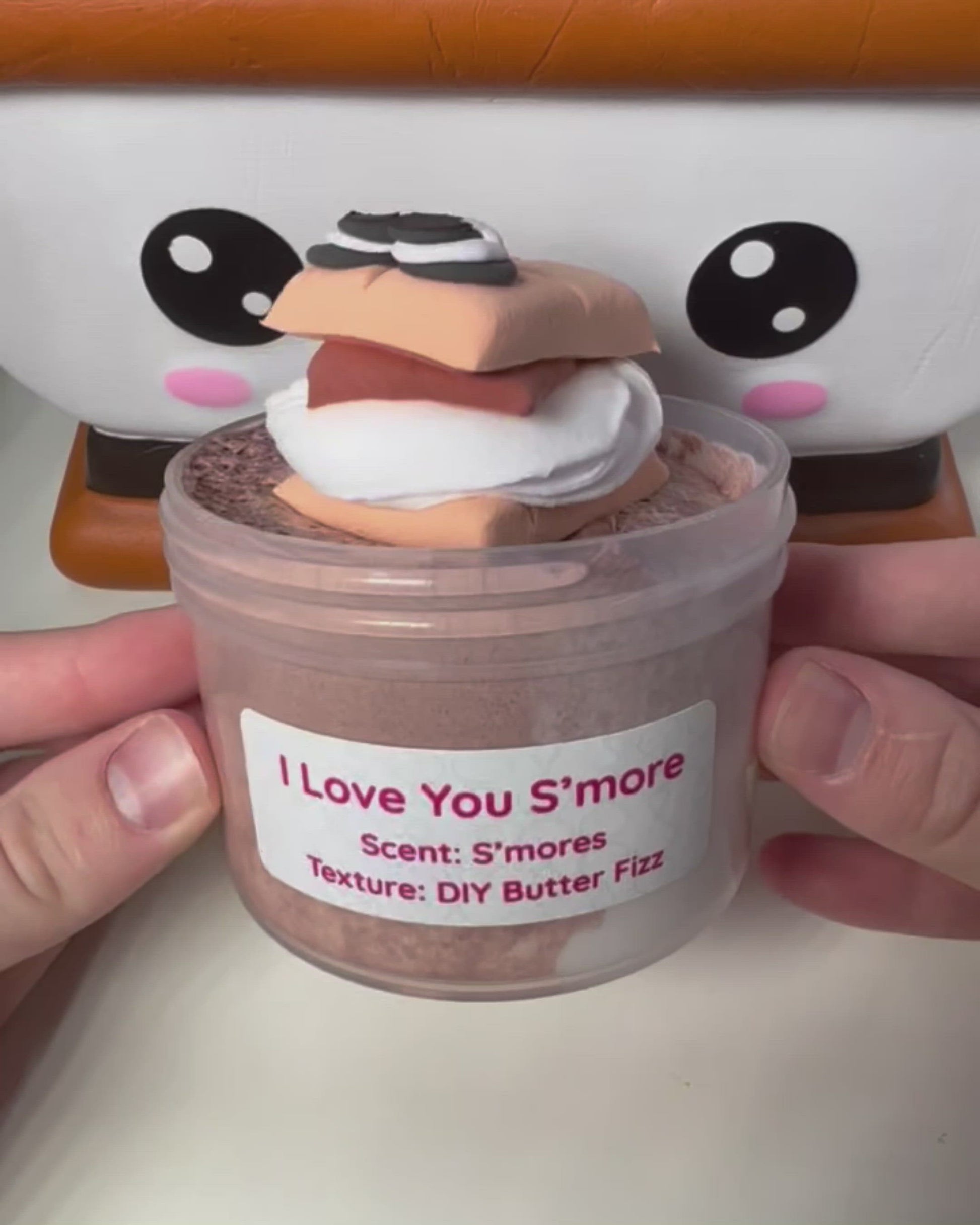 Nothing says July 4th like a melty s'mores. We designed a slimey one, happy face and all, from clay. The s'mores scented base is a sizzly snow fizz in ice cream inspired shades of graham cracker brown and white.