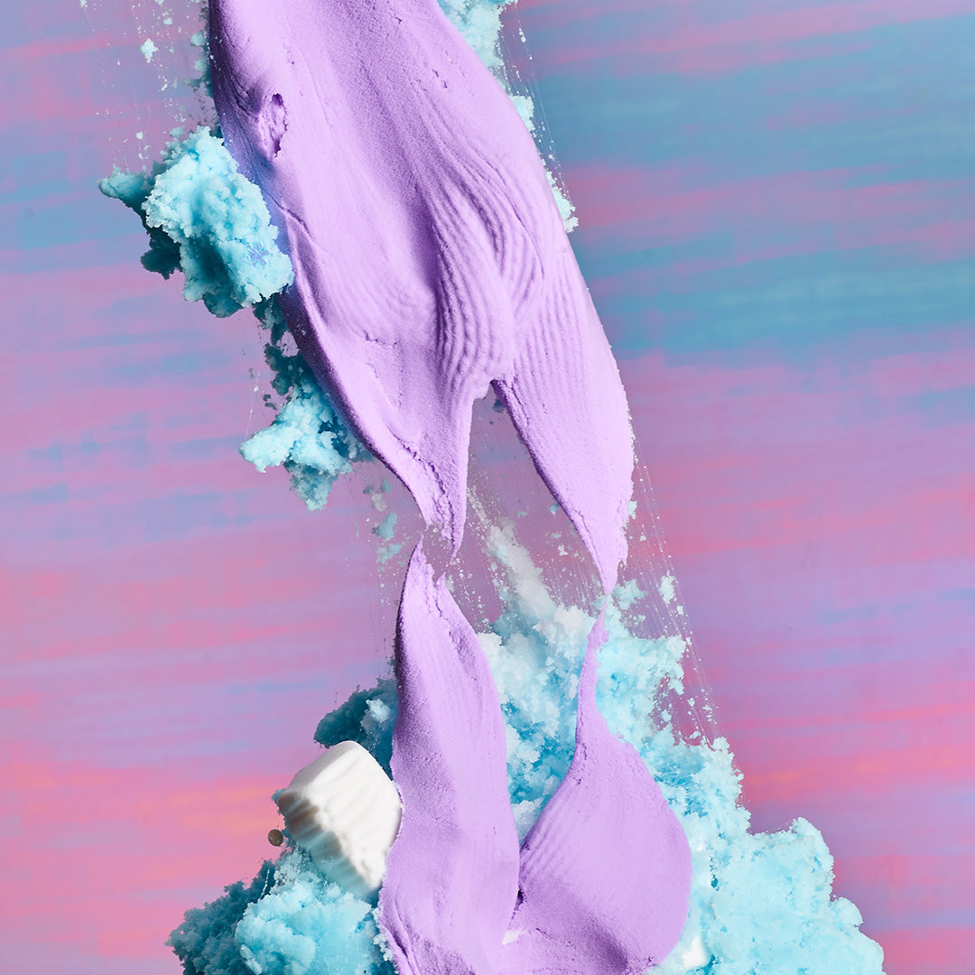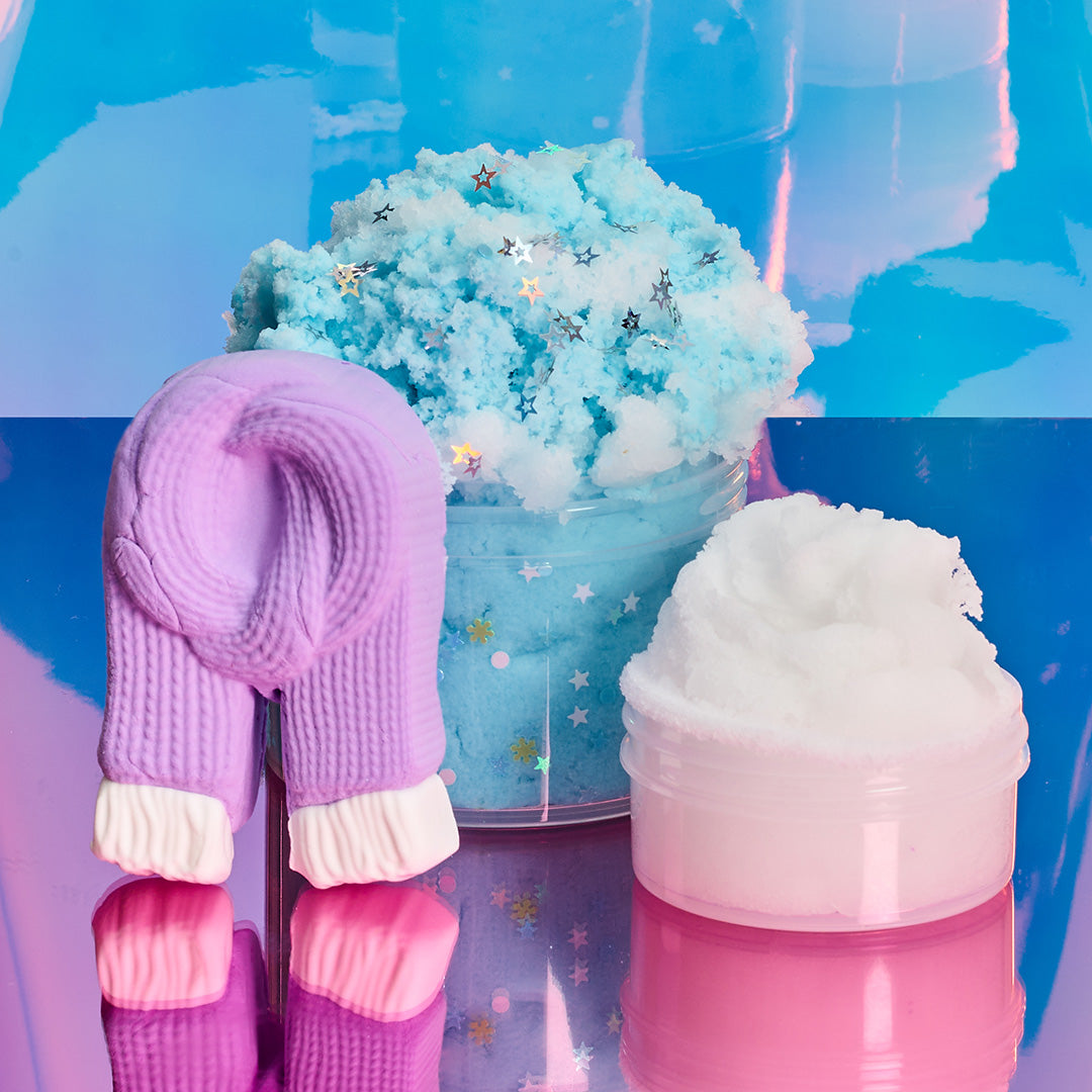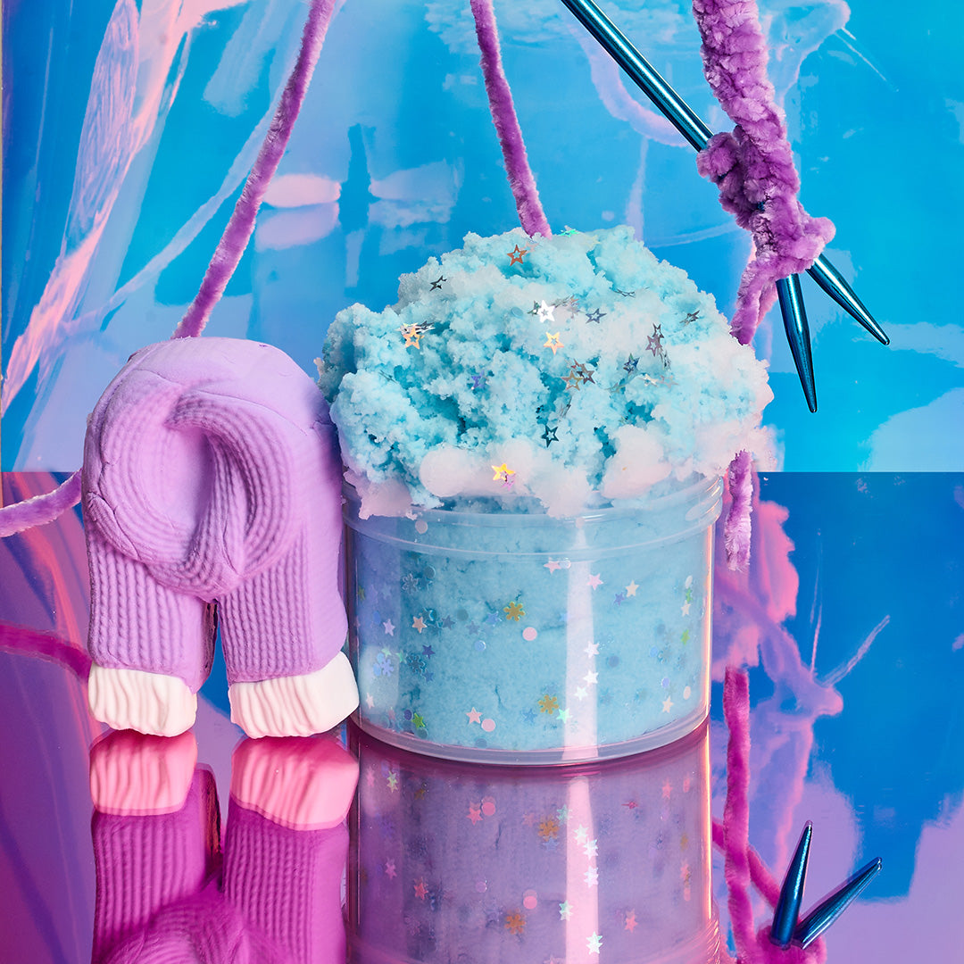The clay scarf is hand made - think of it as couture clay, thanks to the meticulous detail of the knit look. Smush it into the poppy clear slime, made for clicks, pokes, and bubbles, for a more buttery texture.
