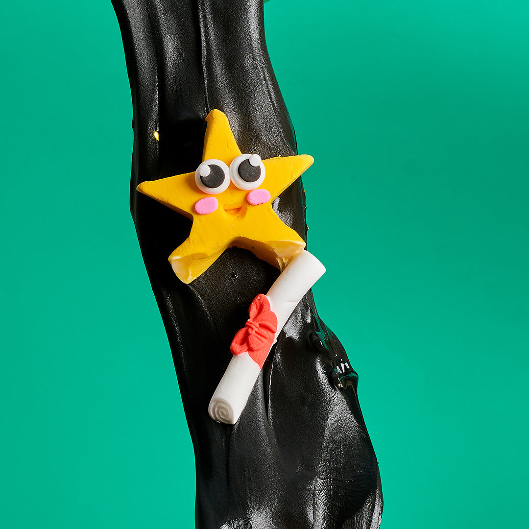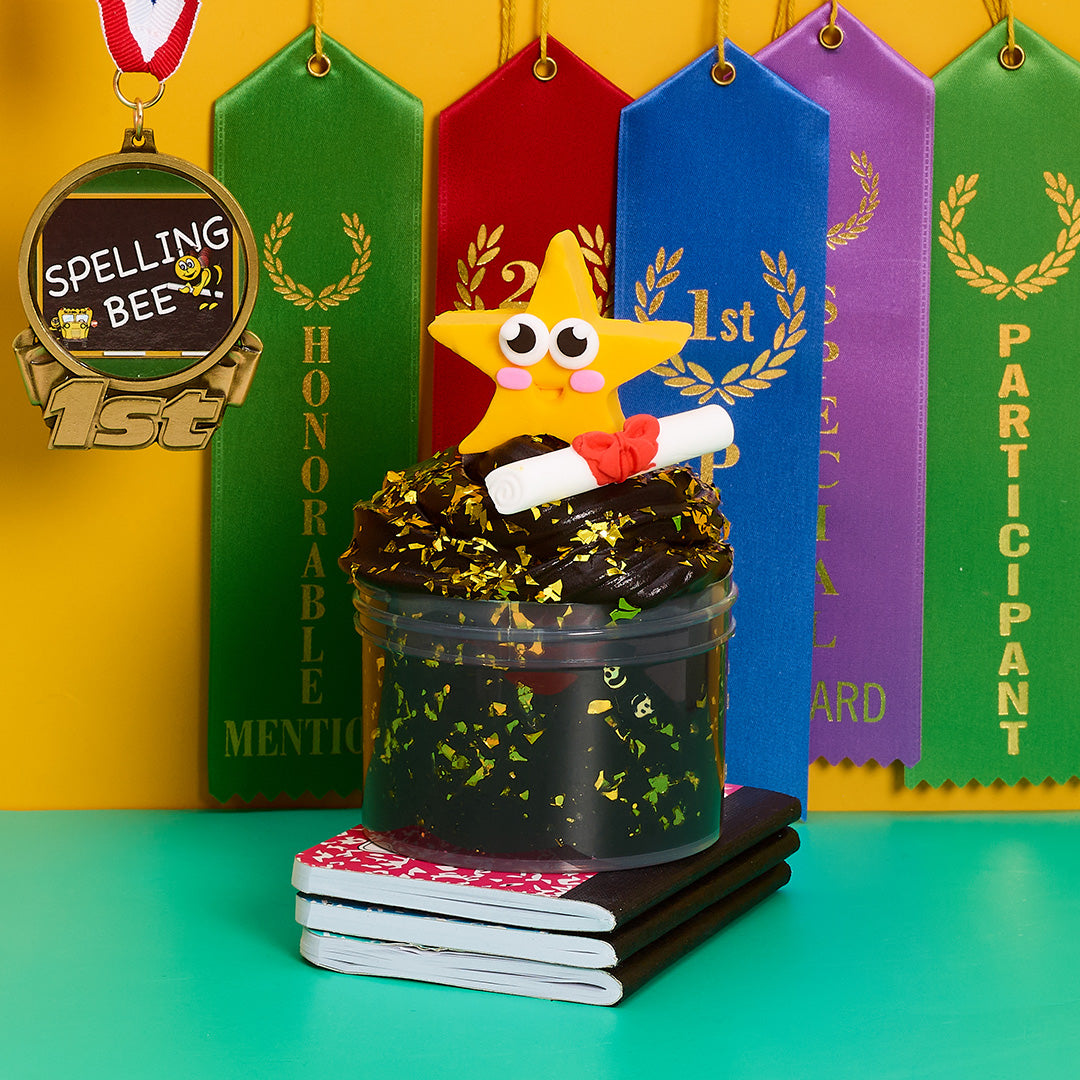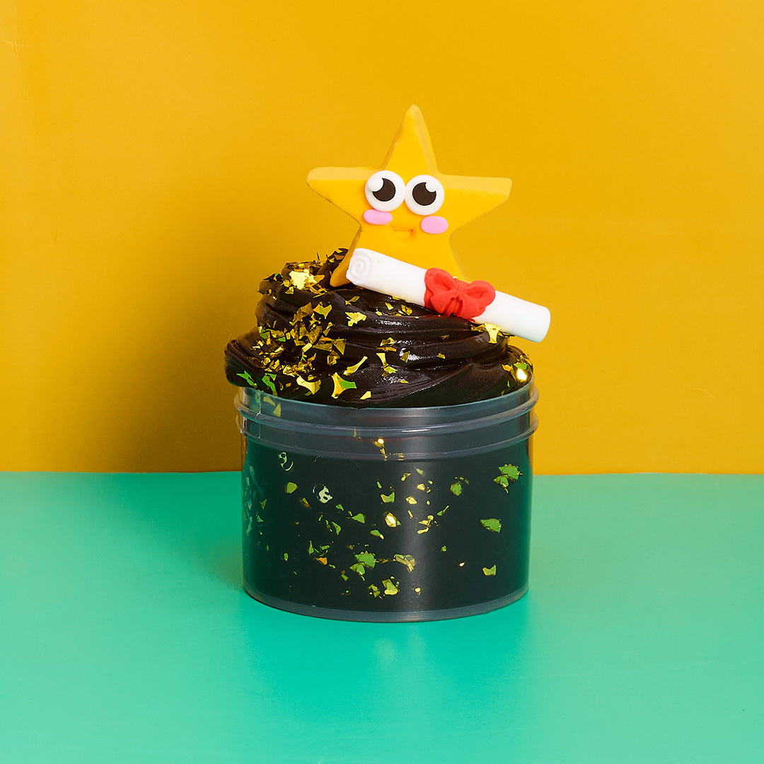 This beautiful, black butter slime, rolled in golden sugar paper, is an A+! It smells like banana flambé (a mix of banana, caramel and brown sugar) and comes with a soft clay gold star that just made honor roll.