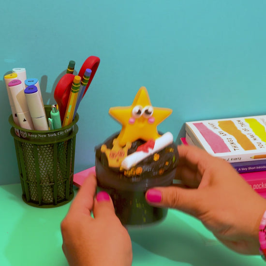 This type is called DIY clay because the clay piece that matches is hand-made (hence DIY) and when you mix it in with the base slime, you create a new texture (so you do-it-yourself too). Sometimes the clay pieces are so cute, it’s hard to imagine squishing them (you can let it dry out and keep it as a little friend). But we promise, mushing is incredibly satisfying. Whatever the base texture is, the addition of clay will make the slime more rich and dough-like and buttery in vibe. You can add the excess to an air-tight container you may have at home or a zip lock bag. Slime is hand-made and artisanal. Squeezing is known to release tense muscles associated with stress. Playing with it has a soothing feeling. Small parts are a choking hazard. Keep away from infants and pets (sofas, clothing and hair too).