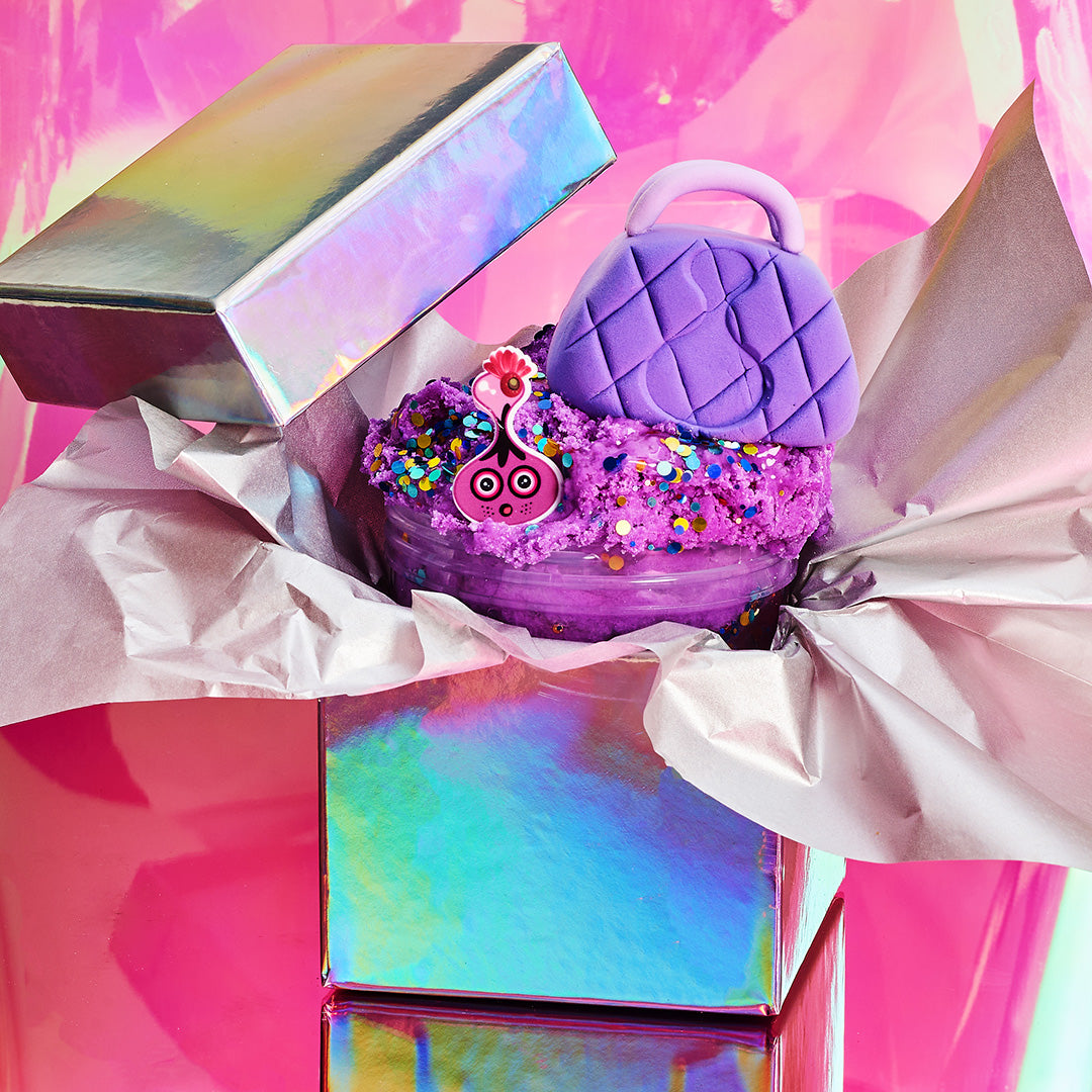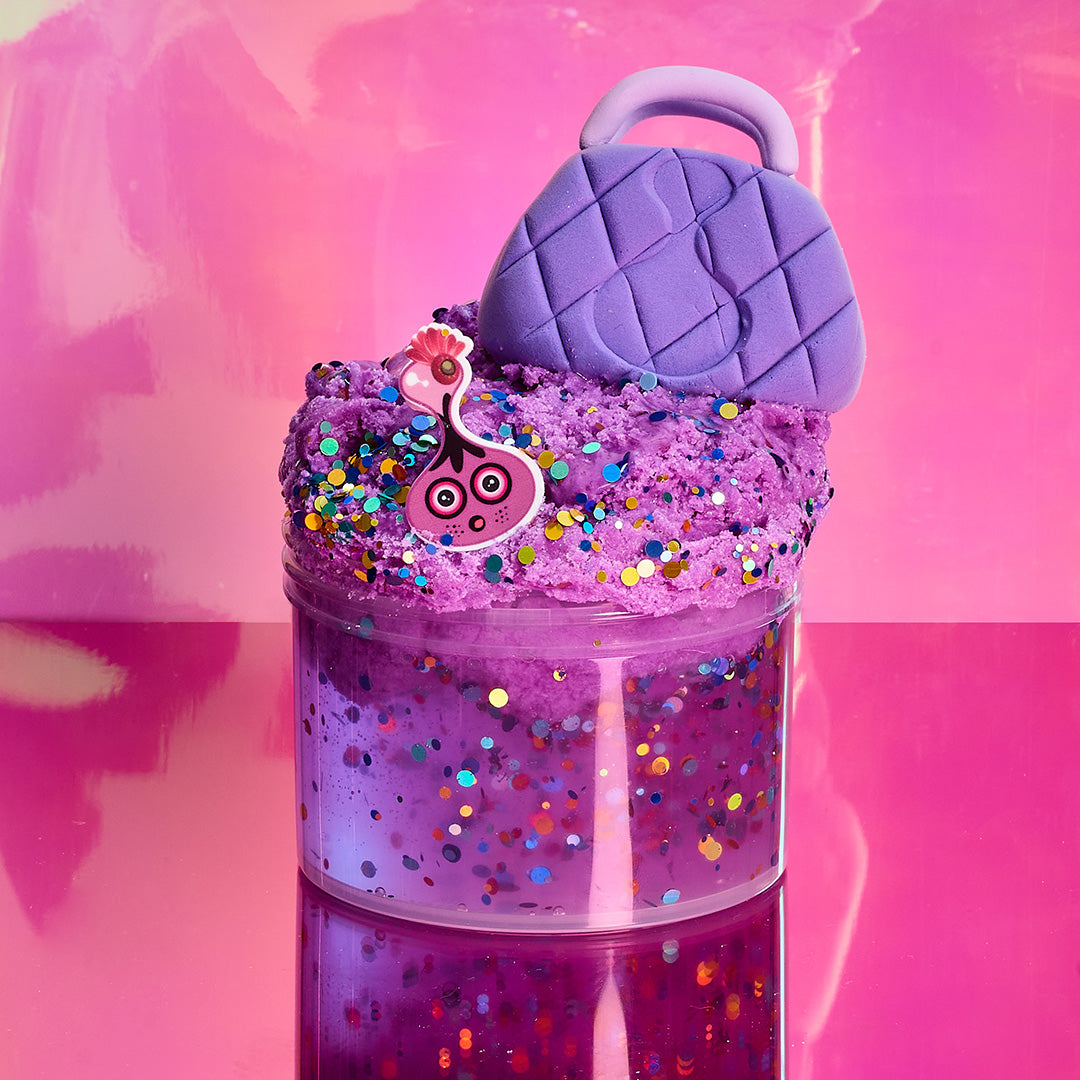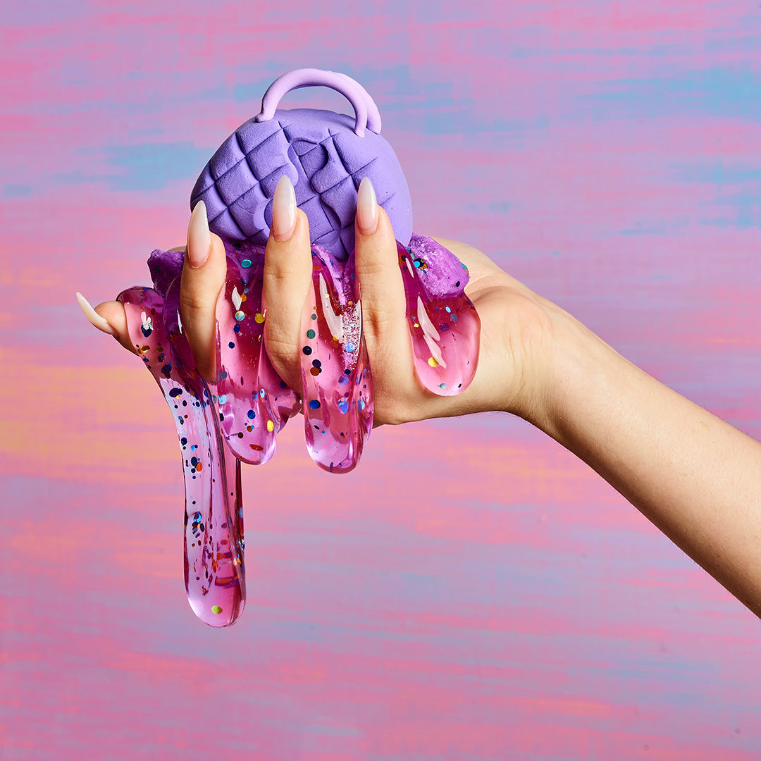The base slime is a lavender clear, layered with a fluffy cloud slime that makes for the creamiest of blends. When you mush in the quilted clay bag, you'll get the chicest feeling your hands will ever know.