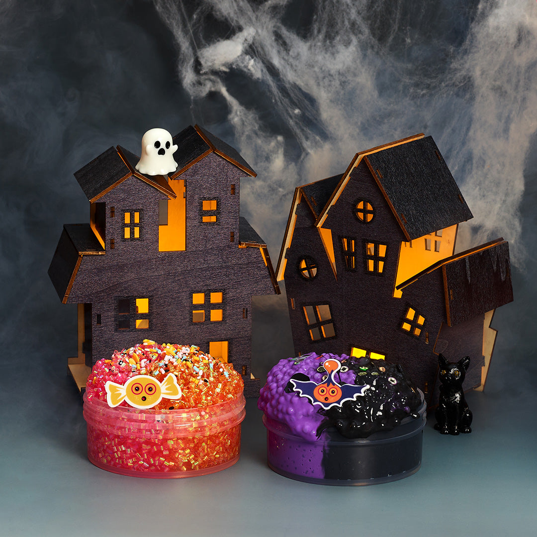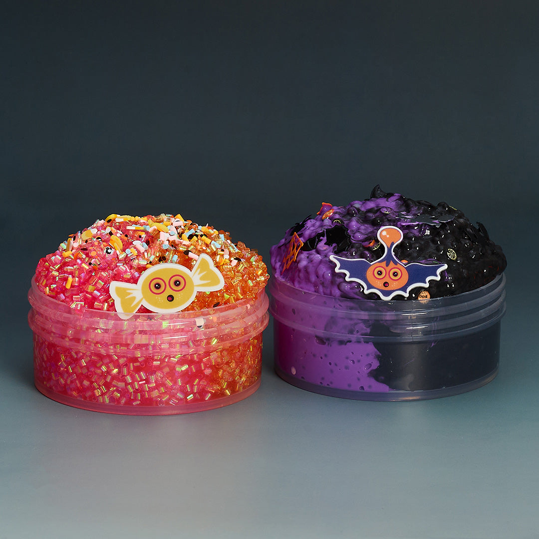One is Trick, a half purple half black slushee slime topped with Halloween inspired Fimos and glitters and an orange bat charm. Slushee slimes are the crunchiest - the perfect sound to scare someone in the night.