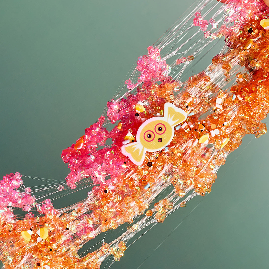 The other slime is Treat, a half orange half pink bingsu slime, topped with rainbow sprinkles, candy corn Fimos, Halloween colored confetti, and a yellow candy charm. With the scent of mixed candy and sizzly crunches of bingu beads, it's the best treat there is.